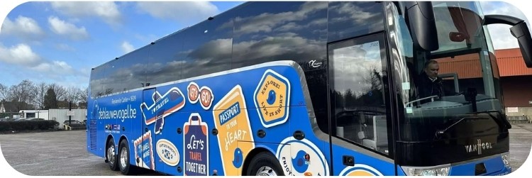 Hier komt de bus je ophalen om je naar het schip te brengen. De meest aangename en zorgeloze service, daar staan we voor bekend bij De Blauwe Vogel!