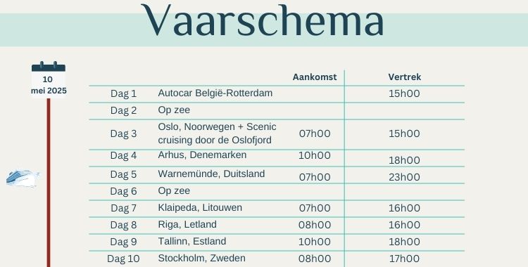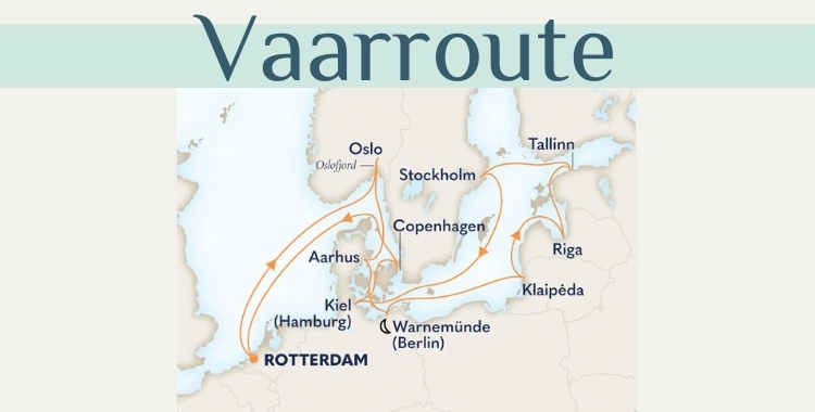 Oslo (Noorwegen): Gelijke tijdzone als België. Arhus & Kopenhagen (Denemarken): Gelijke tijdzone als België. Stockholm (Zweden): Gelijke tijdzone als België. Warnemünde & Kiel (Duitsland): Gelijke tijdzone als België. Tallinn (Estland): 1 uur vooruit ten opzichte van België. Klaipeda (Litouwen): 1 uur vooruit ten opzichte van België. Riga (Letland) : 1 uur vooruit ten opzichte van België.