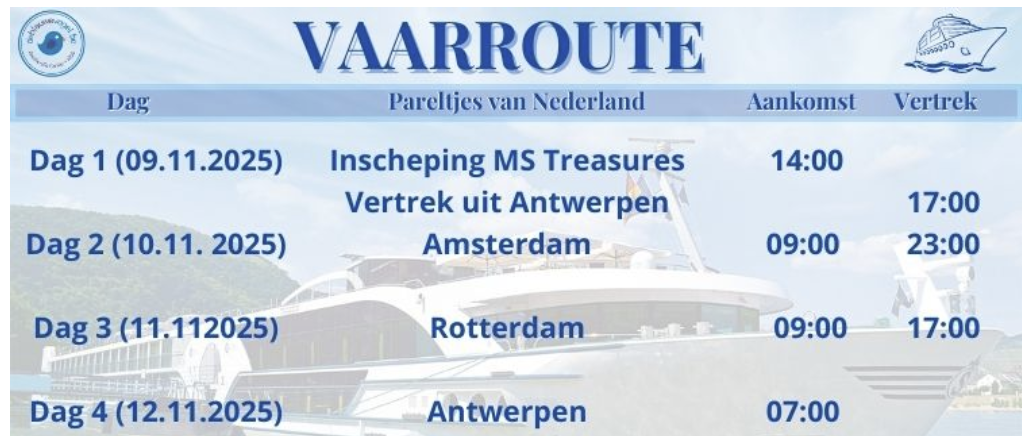 Graag meegaan = nu online boeken. De Blauwe Vogel heeft het volledige schip met garantie ingekocht en dit om U te kunnen laten genieten van prijzen buiten concurrentie.