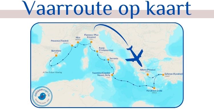 1 uur verschil: Kusadasi (Turkije), Kreta (Griekenland) Geen verschil: Sicilië, Taormina, Sorrento, Civitavecchia, Livorno, Nice, Toulon, Barcelona