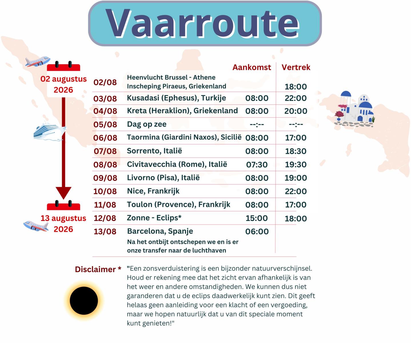 "Een zonsverduistering is een bijzonder natuurverschijnsel. Houd er rekening mee dat het zicht ervan afhankelijk is van het weer en andere omstandigheden. We kunnen dus niet garanderen dat u de eclips daadwerkelijk kunt zien. Dit geeft helaas geen aanleiding voor een klacht of een vergoeding, maar we hopen natuurlijk dat u van dit speciale moment kunt genieten!"