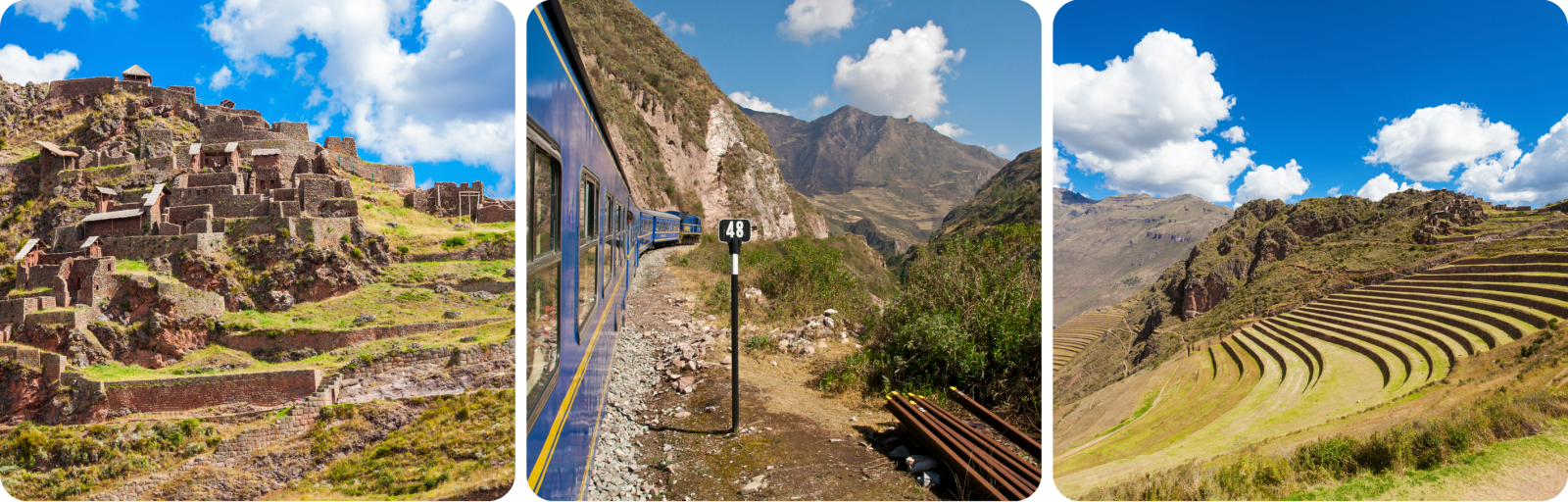 Hier staat een religieus complex van kleine tempeltjes die opmerkelijk geassembleerd zijn met een steen op steen constructie. De tempeltjes gaan tot boven op de heuvel waarvan men een opmerkelijk panorama op de Heilige Vallei en het dorpje Pisac heeft. Hierna vertrek naar het station. Onze grote bagage laten we achter omdat op de trein maximaal 1 stuk van 5 kg per persoon is toegelaten. We nemen de trein naar de fabuleuze site van Machu Picchu.