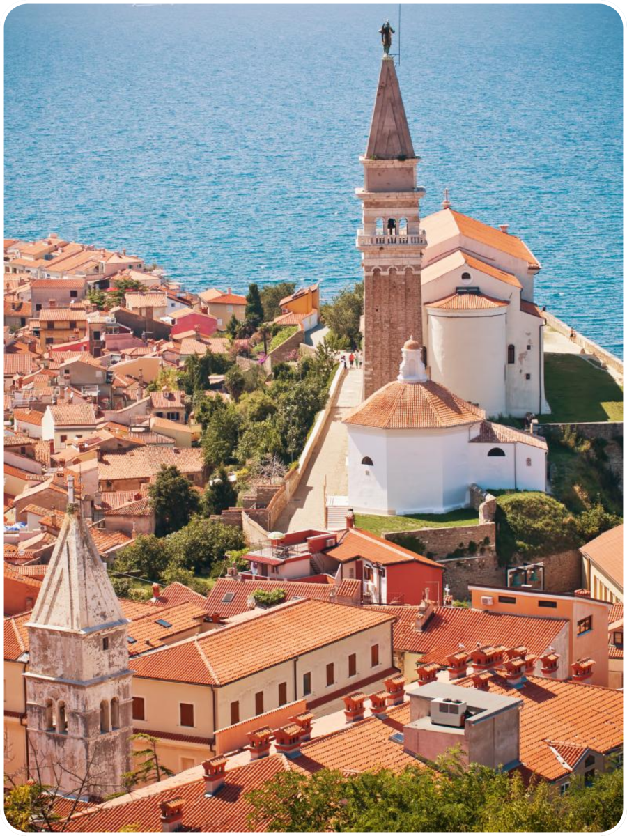 Piran is een charmant kuststadje aan de Sloveense Adriatische Zee, bekend om zijn Venetiaanse architectuur, smalle straatjes en levendige pleinen. Het ligt op een smalle landtong en ademt een mediterrane sfeer uit, met uitzicht op zee aan bijna alle kanten. Het centrale Tartiniplein vormt het hart van de stad, omringd door kleurrijke gevels en gezellige cafés. Piran straalt rust en geschiedenis uit, ideaal om te verdwalen in oude steegjes, te genieten van verse visgerechten en te ontspannen bij zonsondergang aan de promenade.