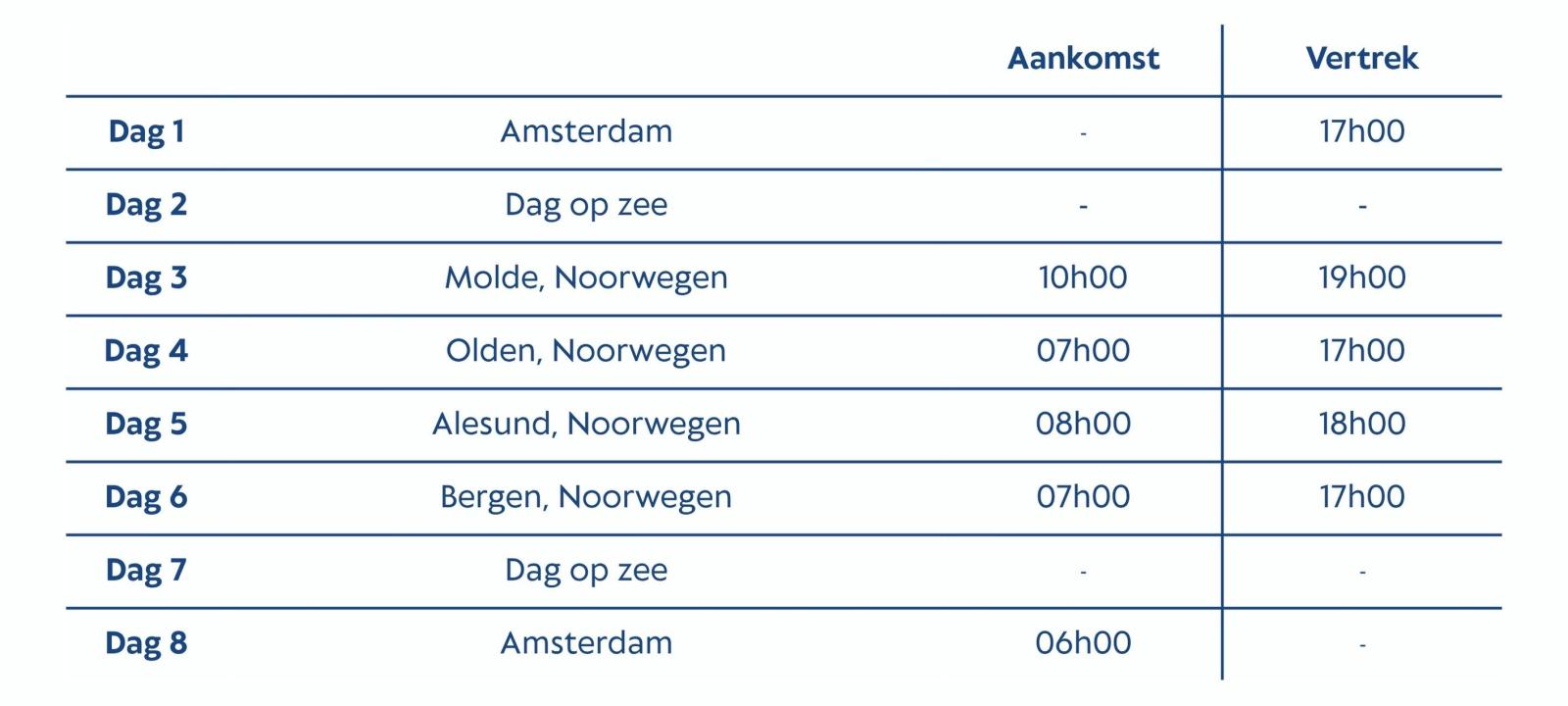 De 8 super voordelen even op een rijtje? 1. De beste rederij : Celebrity cruises * * * * * 2. Culinaire volpension : bijzonder lekkere & verzorgde keuken 3. Fooien & Wifi : ook inbegrepen 4. Uitgebreid drankenpakket : ook al inbegrepen 5. Prachtige vaarroute vanuit Amsterdam 6. Ervaren begeleider die met u meereist vanuit Vlaanderen en ervoor zorgt dat alles vlekkeloos verloopt! 7. Wandelingen worden u gratis aangeboden door uw team Blauwe Vogel-begeleiders in de verschillende aanlegplaatsen! 8. Autocar heen / terug : inbegrepen (& korte transfertijd tot Amsterdam : zalig !)