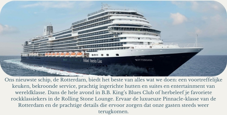 Rotterdam is het derde schip in de nieuwste generatie cruiseschepen van Holland America Line. Het ontwerp combineert de klassieke stijl van Holland America Line met moderne accenten.