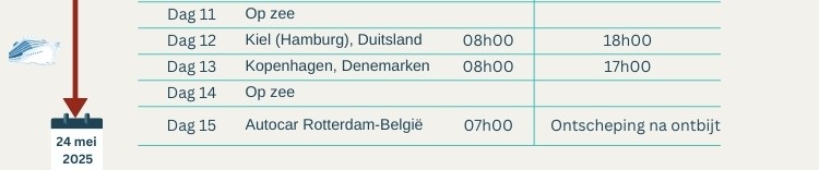 Oslo (Noorwegen): Gelijke tijdzone als België. Arhus & Kopenhagen (Denemarken): Gelijke tijdzone als België. Stockholm (Zweden): Gelijke tijdzone als België. Warnemünde & Kiel (Duitsland): Gelijke tijdzone als België. Tallinn (Estland): 1 uur vooruit ten opzichte van België. Klaipeda (Litouwen): 1 uur vooruit ten opzichte van België. Riga (Letland) : 1 uur vooruit ten opzichte van België.