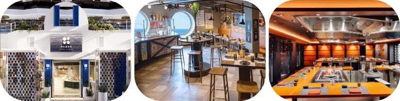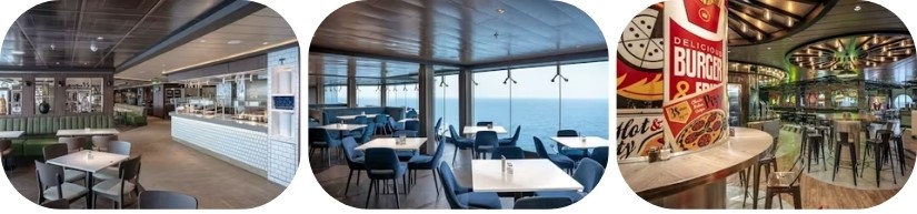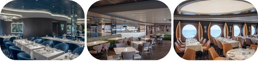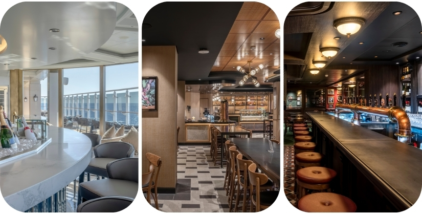 Aan boord vinden gasten tal van nieuwe en herontworpen ruimtes om te ontspannen, te genieten van het adembenemende uitzicht of een voorstelling bij te wonen, terwijl ze nippen van een warme koffie of een verfrissende cocktail.