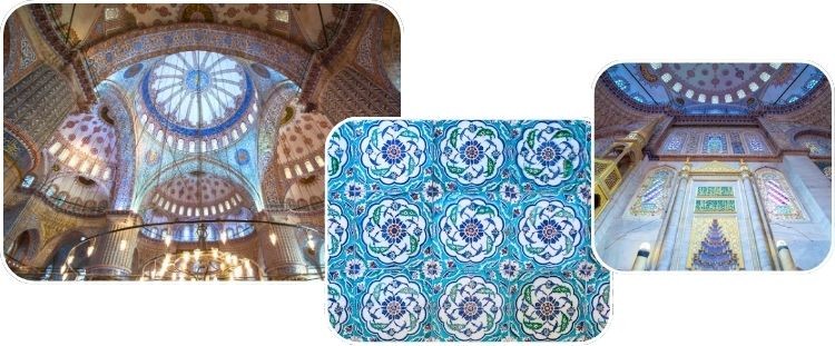 De beroemde tegels van de Blauwe Moskee zijn Iznik-tegels, genoemd naar de stad Iznik (het oude Nicea), die in de 16e en 17e eeuw het centrum was van de fijnste keramiekkunst van het Ottomaanse Rijk. Ze zijn met de hand beschilderd in diepe kobaltblauwe, smaragdgroene en warme rode tinten, vaak met sierlijke patronen van tulpen, anjers, irissen en abstracte motieven. In de Blauwe Moskee vind je er meer dan 20.000, elk uniek in nuance en detail, maar samen een harmonieuze zee van kleur die de wanden, nissen en koepels siert. Het blauw geeft de ruimte een koele, bijna hemelse gloed, vooral wanneer het zonlicht door de gebrandschilderde ramen valt. Deze tegels waren niet alleen decoratief, maar ook een statement: een toonbeeld van vakmanschap, rijkdom en de artistieke verfijning van het Ottomaanse hof.