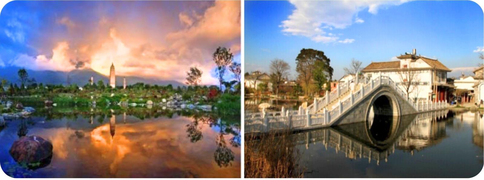 Het perfect prentkaartje: 4000 meters hoge bergen, het 40 kilometerslang Erhai meer, een groene vallei op 2000 meters hoogte met een mild klimaat en al voor meer dan 1000 jaren 3 statige pagodes. Dit is het beeld van de oude hoofdstad van het koninkrijk van Nanzhao. In de vele agrarische dorpen van de Bai ethische groep voor wie wit de belangrijkste kleur is - staan mooi verzorgde 2 verdiepingshuizen met dubbele daken, houten klapdeuren en versierde kozijnen. De Bai versieren hun muren graag met elegante waterverfschilderingen en veel huizen staan vol camelia’s en bougainvilles. Het dorp Xizhou is daar een prachtig exemplaar van.