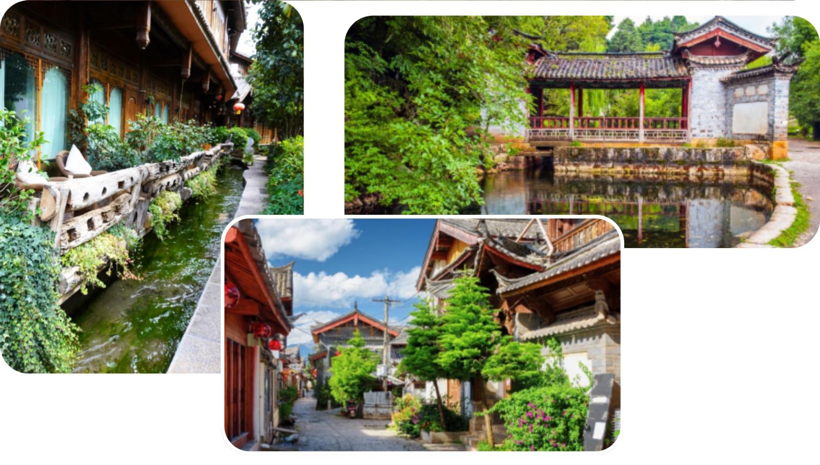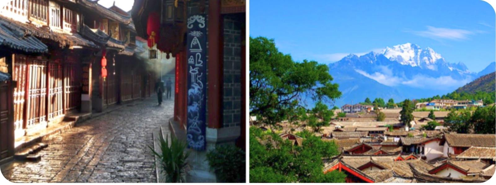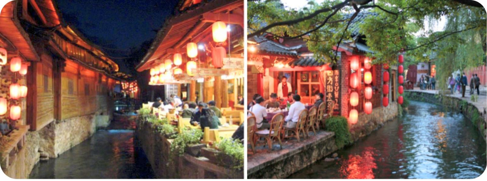 s’Ochtends ziet men er kinderen gebukt boven de slootjes hun tanden poetsen alvorens ze hun ontbijt van gestoomd brooddeeg gaan kopen en naar hun school rennen terwijl de oudere Naxi vrouwen in hun typische blauw schorten hun (af) was doen in dezelfde kanalen waar het helder bergwater doorstoomt. Vanop de Lion Hill heeft men een prachtig zicht op honderden sierlijk gekrulde daken van grijze dakpannen. en de besneeuwde toppen van de Jade Dragon Mountain. Lijiang is beschermd Erfgoed van de UNESCO Rode lantarens, terrasjes en winkels open tot s’avonds laat maken het erg gezellig.