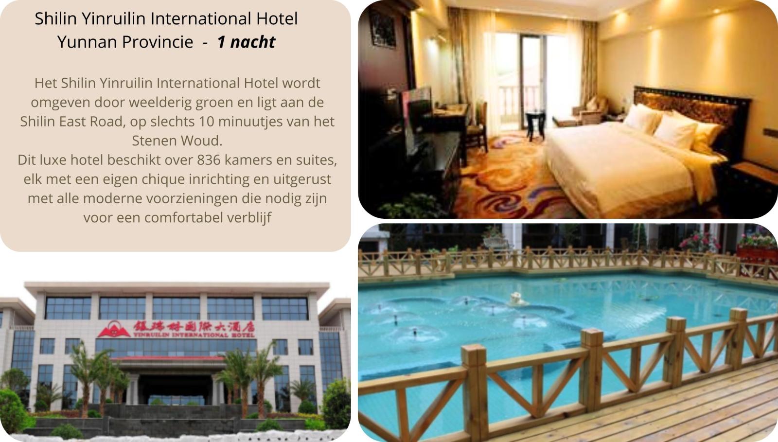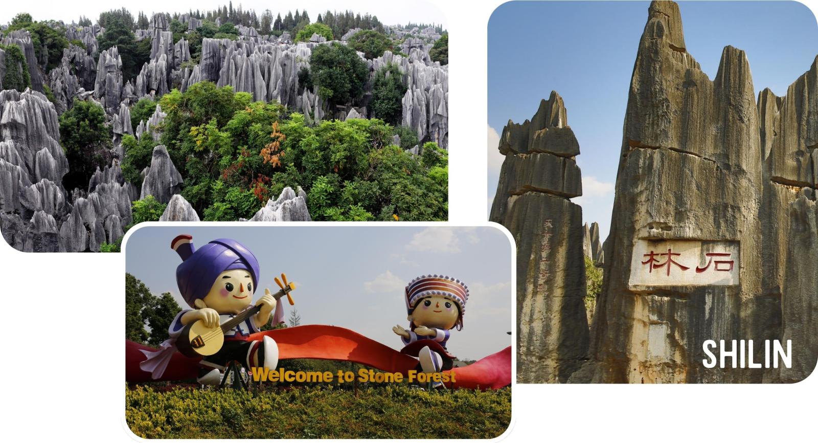 Aankomst in Beijing – immigratie formaliteiten. Vlucht naar Kunming. Ontvangst door uw Nederlandstalige begeleider. Vertrek naar Shilin op 70 km van Kunming waar we onze intrek nemen in het Yinruilin International hotel. In de namiddag bezoeken we het Stenen Woud: merkwaardige karstformaties die zich uitstrekken over een oppervlakte van 500 km². Wij maken een rustige wandeling tussen rotsachtige pieken en soms over smalle paadjes. Hierna keren we terug naar het hotel voor het diner.