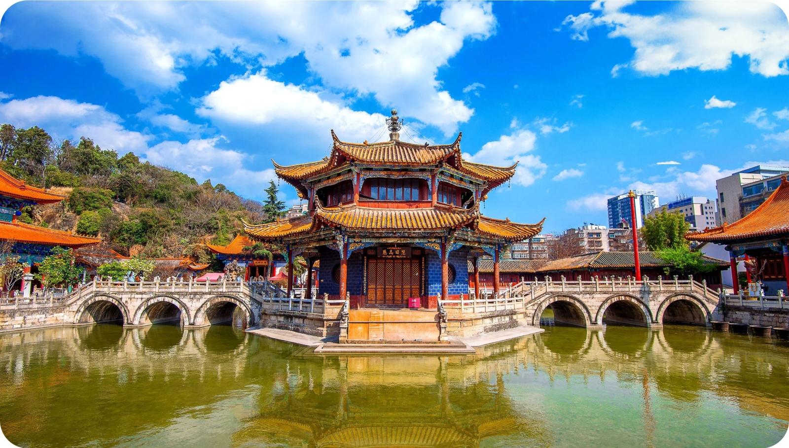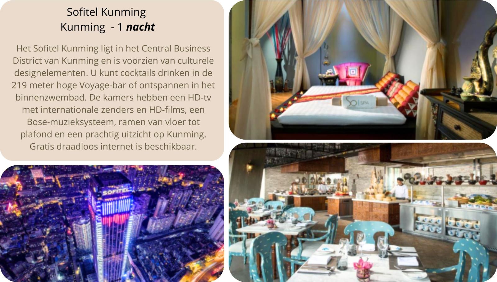 Na het ontbijt vertrekken we naar het station van Lijiang en nemen we de hogesnelheidstrein richting Kunming, de hoofdstad van Yunnan. Bij aankomst rijden we naar de Westelijke Heuvels. Op 15 kilometer van het stadscentrum bevindt zich de ‘Berg van de Schone Slaapster’. Met een stoeltjeslift gaan we naar de zogenaamde Drakenpoort. Hier staan we boven op een klif die over het immense Dian-meer neerkijkt. Tijdens de afdaling passeren we enkele gangpaden die in de rotsen zijn uitgehouwen. Hierna rijden we naar het Sofitel hotel waar we van een prachtig buffet kunnen genieten en overnachten.