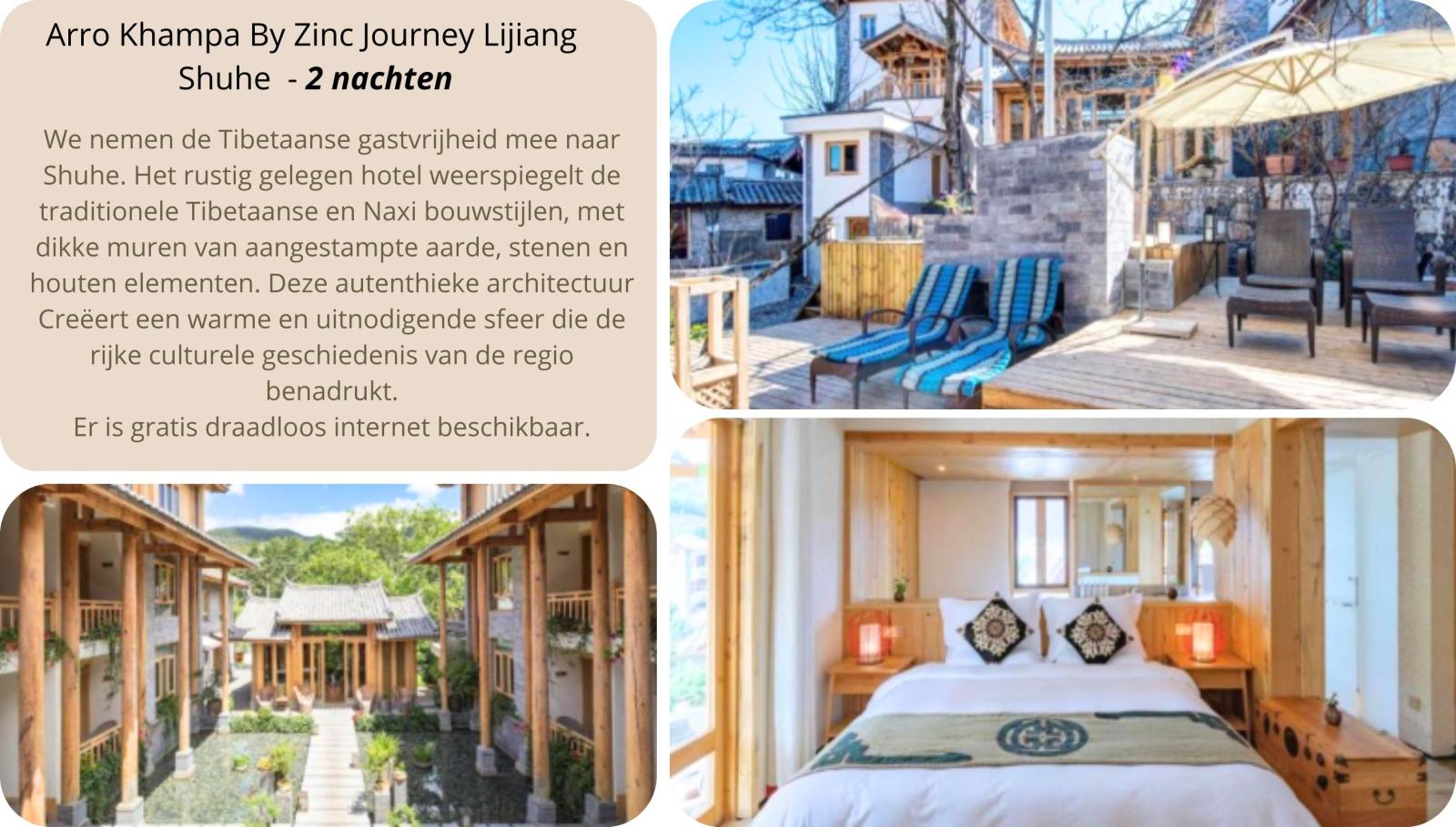 Na ons Tibetaans middagmaal vertrekken we richting Shuhe waar we onze dag eindigen. Verscholen tussen het groen, aan de voet van de Jadesneeuwdraakberg is Shuhe een fraai bewaard gebleven plaats aan de oude Theeroute en is door Unesco erkend als belangrijk onderdeel van het Lijiang werelderfgoed. Shuhe was één van de eerste nederzettingen van de Naxi. De 25 meter lange en 4 meter hoge stenen Qinglong-brug dateert uit de Ming-dynastie (1368-1644) en wordt beschouwd als één van de mooiste bruggen in de regio van Lijiang. Overnachting in Overnachting in het Arro Khampa by zinc journey Lijiang.