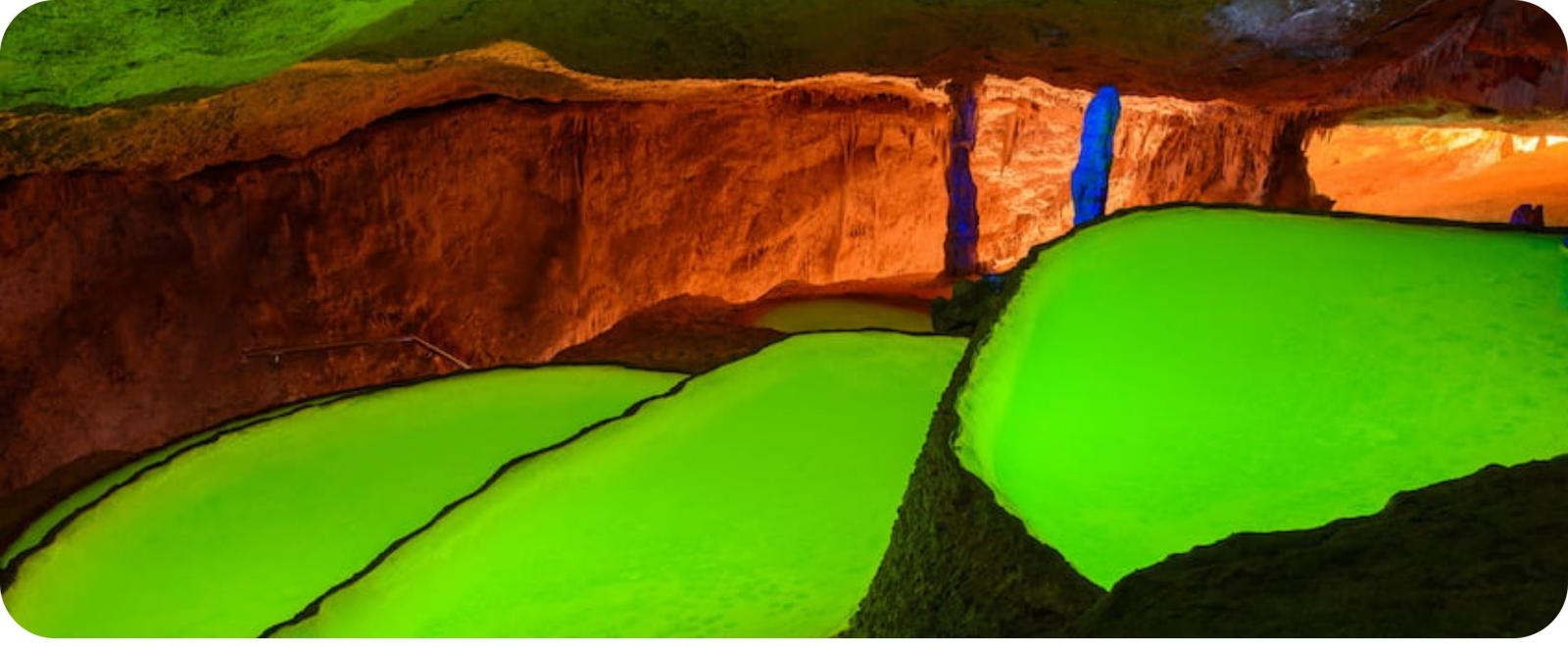 Binnenin krijgen we te maken met een spectaculair verlicht grottenstelsel en aanhoren we de geschiedenis met een illegaal tintje. Aan de buitenkant hebben we eveneens zicht op talloze prachtige kliffen.