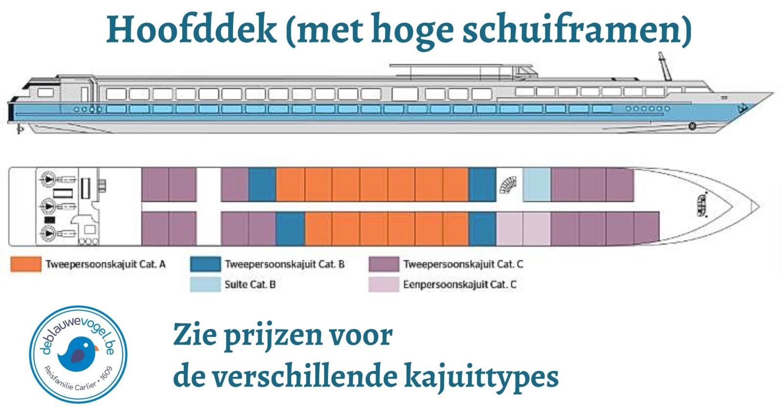 Hoofddek 31 Dubbelkajuiten 2 Singlekajuiten (voor snelle beslissers) 1 Suitekajuit