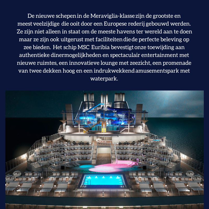 Ontsnap aan de alledaagse drukte en laat jezelf onderdompelen in een wereld van ongekende luxe en verwennerij tijdens een dag op zee op ons adembenemende cruise schip MSC Euribia.